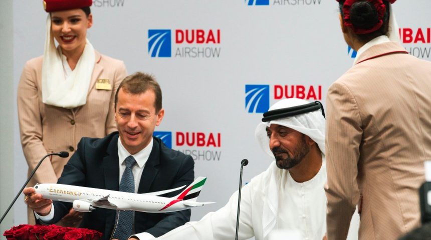 Laut Preisliste hat das Geschäft einen Wert von mehr als 14 Milliarden Euro: Flugzeugbauer Airbus hat sich auf der Luftfahrtmesse in Dubai einen Großauftrag für das Modell A350 gesichert. Jon Gambrell / AP Airbus-Chef Guillaume Faury und Emirates-CEO Scheich Ahmed Ibn Said al-Maktum bei der Vertragsunterzeichnung Montag, 18.11.2019 12:28