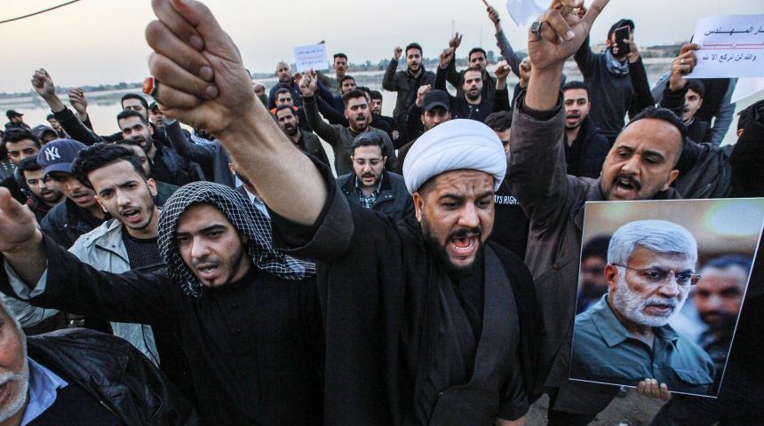 Im Irak hat es einen Luftangriff auf mehrere Fahrzeuge gegeben. Darin sollen sich Berichten zufolge hochrangige Mitglieder schiitischer, von Iran unterstützter Milizen befunden haben. Ameer Al Mohmmedaw/ DPA Menschen in Bagdad protestieren gegen einen US-Luftangriff im Irak, bei dem unter anderem der iranische General Soleimani und „Volksmobilisierungseinheiten“-Vizechef Muhandis (auf dem