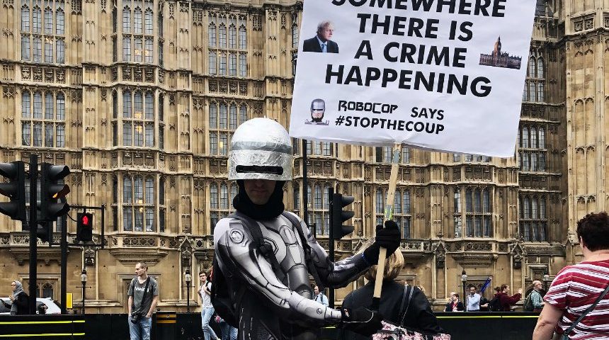 Eine Schauspielerin im Suffragetten-Outfit, ein Maler, ein Familienvater im Robocop-Kostüm: Sie sind vereint in ihrer Abneigung gegen Boris Johnson und den Brexit. Eindrücke aus Westminster. Georg Fahrion/ DER SPIEGEL Mittwoch, 04.09.2019 23:14 Uhr Vor dem Palace of Westminster mitten in London steht Robocop. Er trägt einen metallisch schimmernden Ganzkörperanzug,